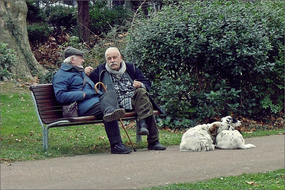 Bello lo sguardo compiaciuto del signore verso di te, come è bello vedere un amicizia durare nel tempo e nello spazio delle cose. Adorabile la tenerezza che riesce a trasmettere quella posa del cane che sente fiducia e attaccamento al suo amico. Davvero una scena piacevolissima Sergio , vecchi gli amici , vecchiotti i cani, uno splendido ritrovarsi! Bravissimo, meraviglioso momento colto.