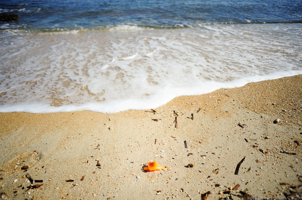 Il granchio è quella cosa arancione in basso; è un'esca di plastica e serve ad attirare i polpi. Qualcuno l'avrà perduta, (si nota ancora un pezzettino di lenza con l'occhiello), e forse il mare l'avrà riportato a riva. L'ho trovato lì, in quella posizione: è come se in un certo senso volesse riguadagnare il mare...