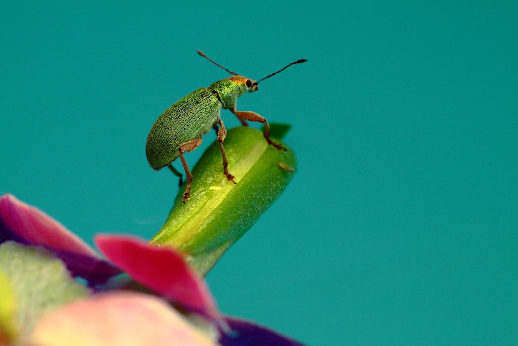 Lo sfondo è naturale visto che avevo messo l'insetto ed i fiori in una insalatiera piena d'acqua!