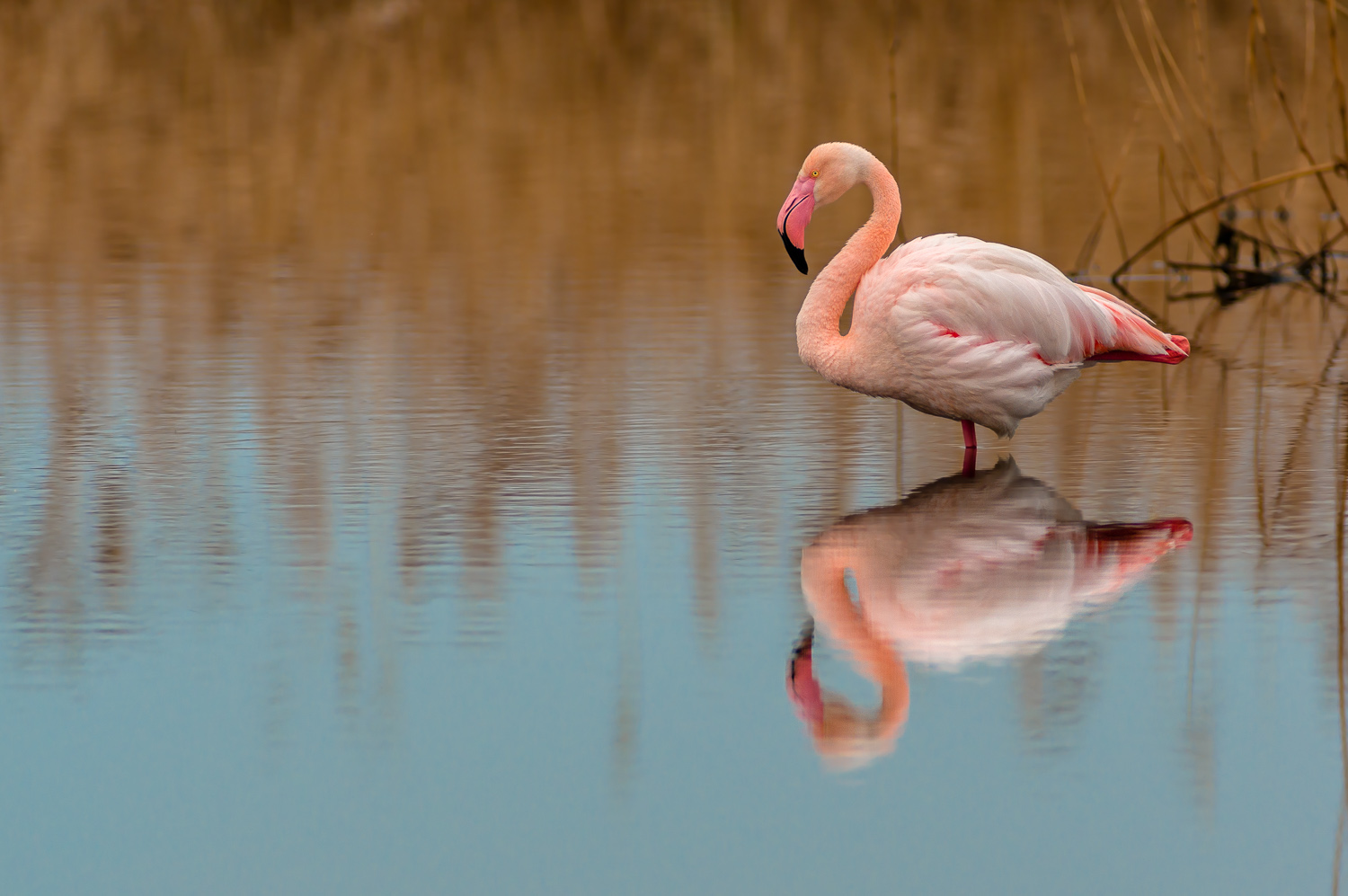 La bellezza delle sfumature graduali di sfondo e relativo riflesso, ed il colpo di colore in rosa del bel soggetto principale, armoniosamente decentrato, mi fanno apprezzare molto questa proposta. Tecnicamente ci sarà chi potrà darti il massimo della competenza dei riscontri, ma per me la nitidizza del fenicottero non è facilmente valutabile con certezza a queste dimensioni, anche se mi pare buona.