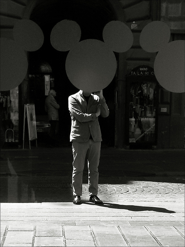 Pare che con la mano tenga la sagoma di Mickey Mouse. Ben colta, complimenti.