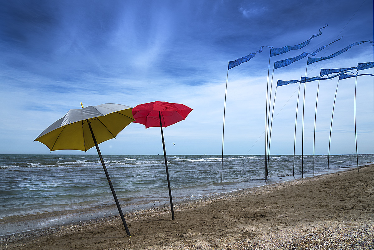 Maschera di contrasto e colori troppo saturi, timbro clone sotto ombrello giallo, bandiere tagliare, aloni bianchi ad X sopra gli ombrelloni, non so se naturali o meno, sono i difetti di questa proposta che saltano fuori.