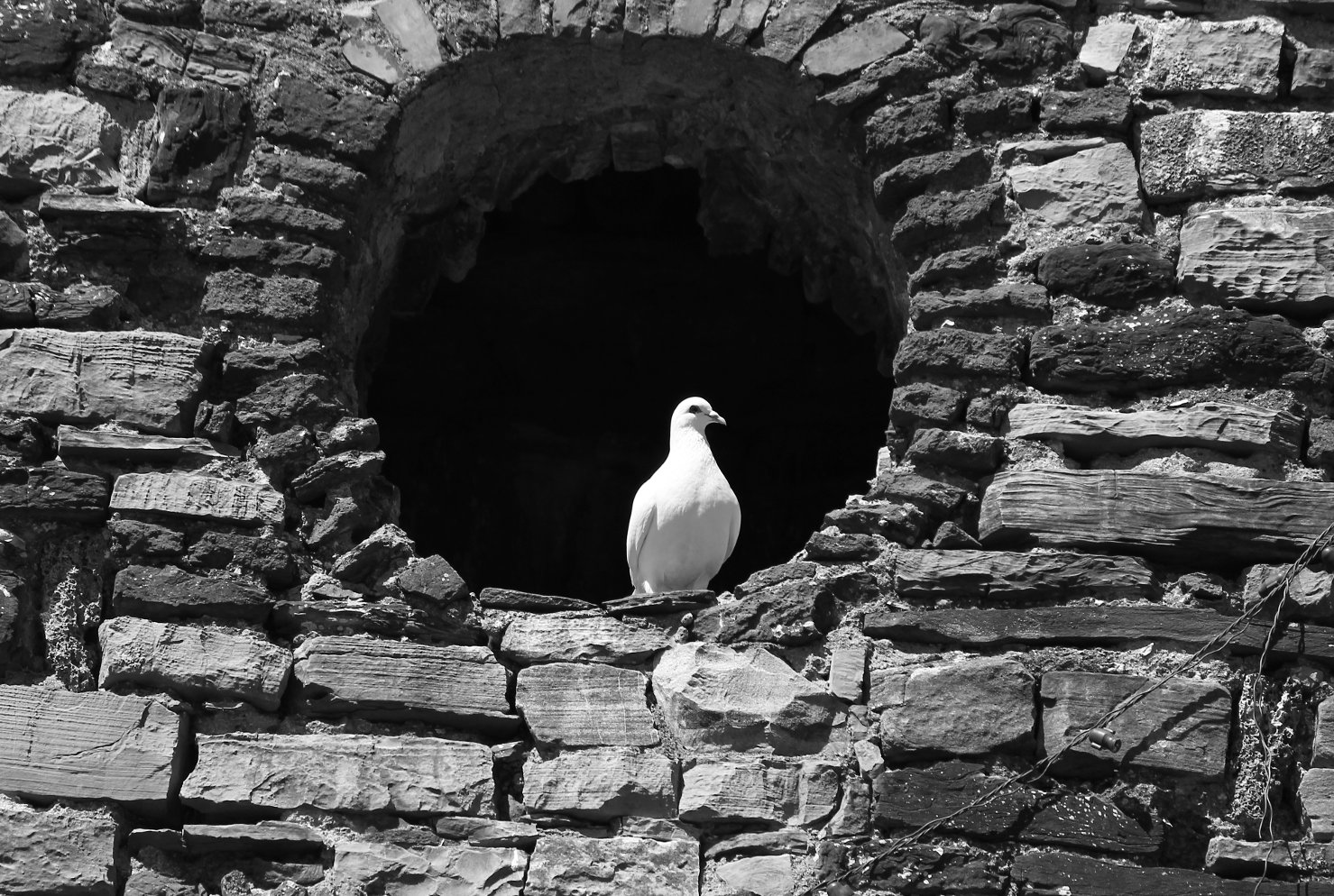 | Simpatico questo pennuto che si affaccia da un oblò di pietre. Mi sembra che la foto penda un po a dx . Non male il b/n anche se il bianco del pennuto é un po bruciato