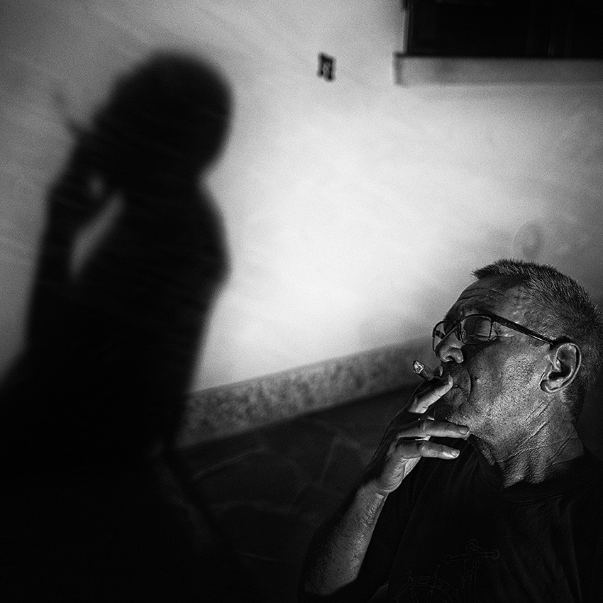 Accidebolina.. mi manca quel nulla di spazio sulla destra del fotogramma. Ma per ogni altra cosa... un signor ritratto. Ci narri il tuo protagonista con intensità, addirittura mostrandoci il suo alter ego d'ombre, e senza che lui neppure alzi lo sguardo. Proprio le sue palpebre serrate, sul piacere della boccata di fumo... sono eloquenti.