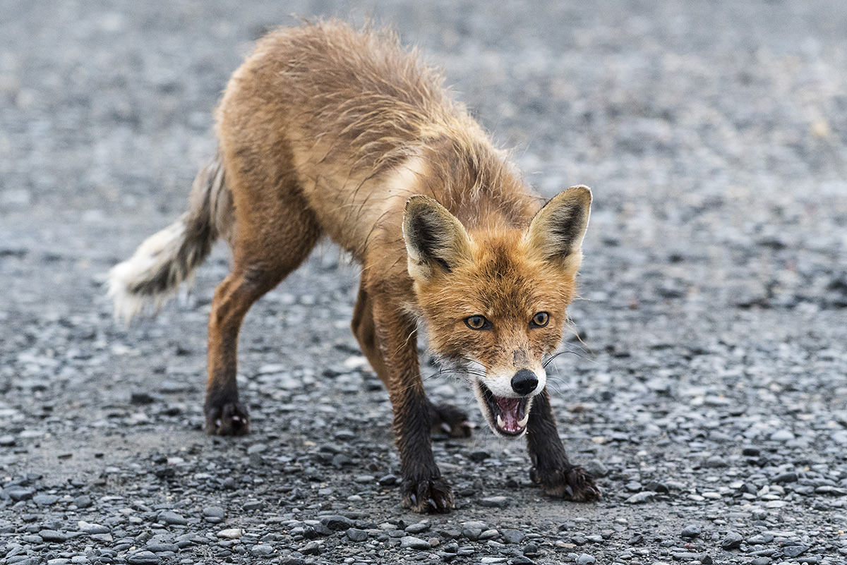 Un po' inquietante questa immagine, sia per la bella mostra dei canini che per come è conciata questa volpe. Punto di ripresa troppo alto.