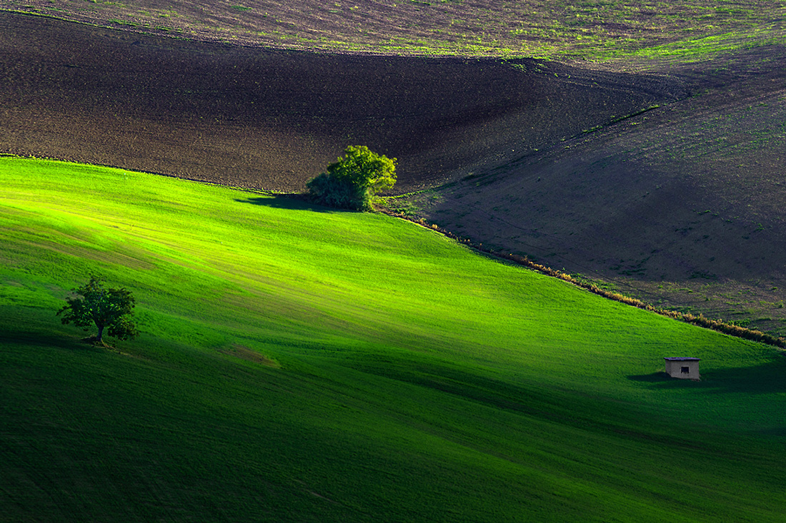 Una lunga lingua di verde e di luce, su cui piccole chiome alberate e casetta sembrano scivolare lentamente. Di grande effetto.