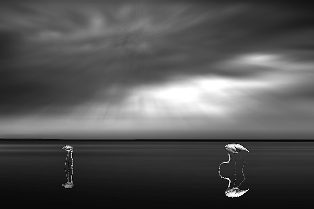 Qui invece i fenicotteri sono lontani l'uno dall'altro, quasi si ignorano, e i loro doppi, tecnicamente , sembrano un pizzico inquietanti... Aggiungi quel punto nel cielo, come un centro magnetico che sta per aprirsi....mmm