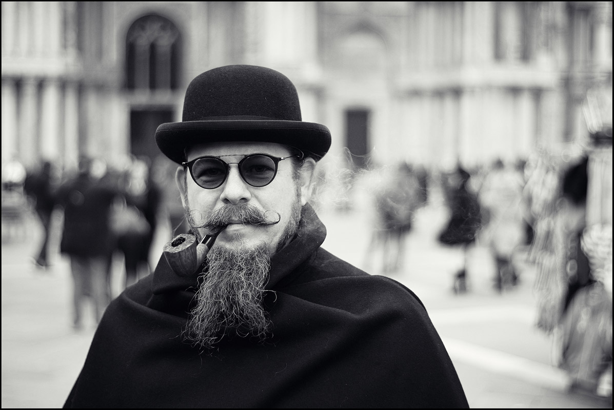 Grande nitidezza al punto da discernere il fumo della pipa tra i capelli ed anche gli occhi sotto le scure lenti. Molto bello pure lo sfocato morbido ma pure leggibile che ben contestualizza il luogo.