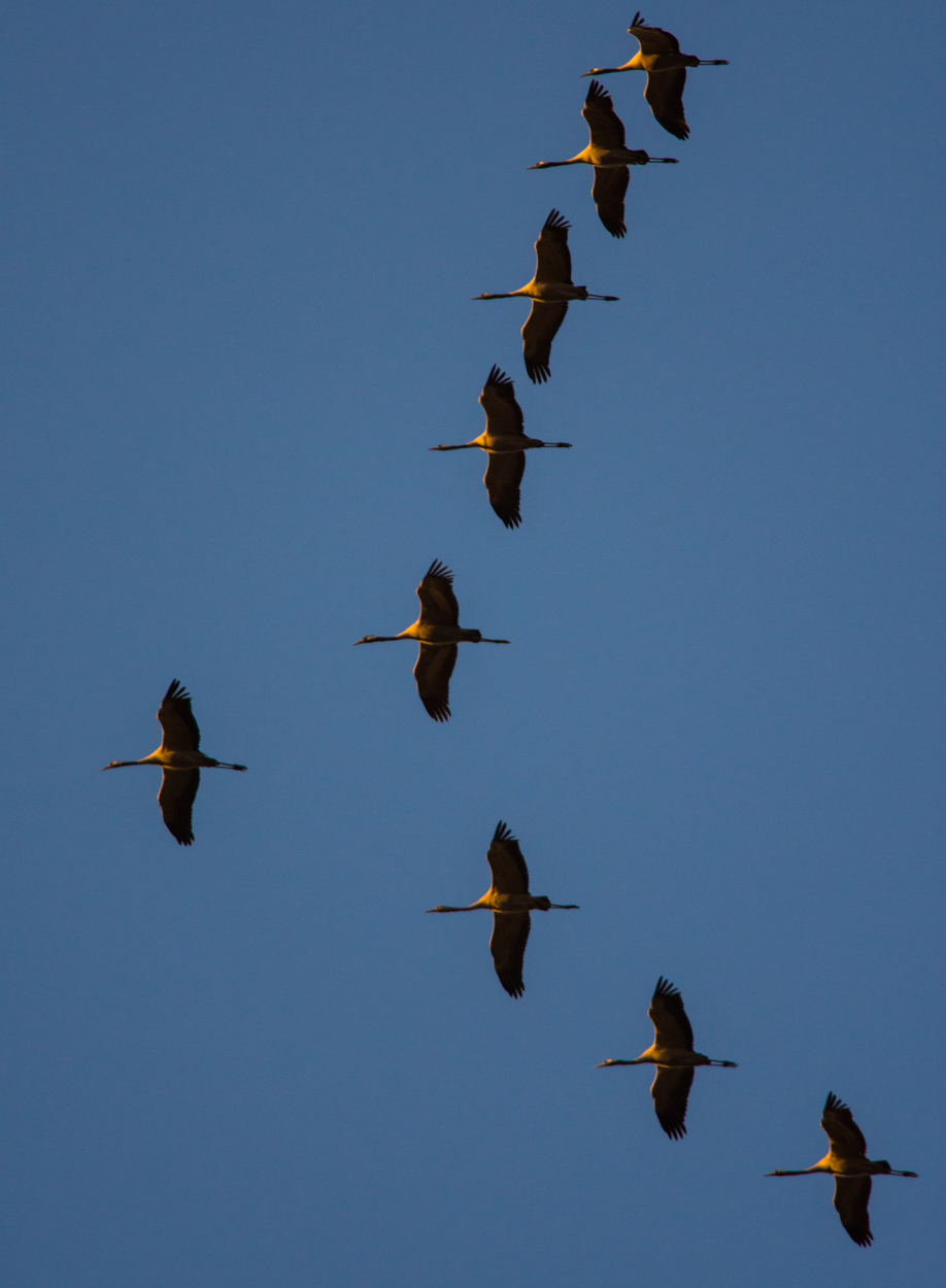 ciao e benvenuto anche da parte mia... ti presenti con una bellissima squadriglia di Gru. Immagine molto gradevole ma un po scuretta, con ombre un po chiuse...in fase di scatto, compensando in positivo e alzando un po gli iso per mantenere tempi di scatto adeguati, avresti ottenuto una esposizione migliore, ma hai anche modo di correggere in pp...ti aspettiamo con altri scatti