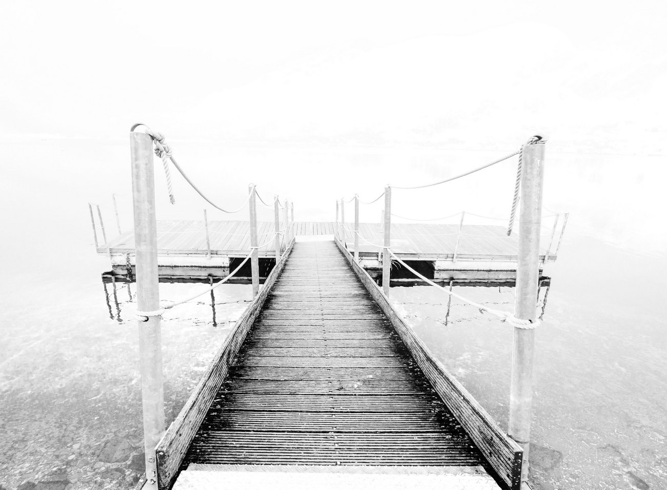 Mi piace moltissimo questa tua proposta per la bella resa in alta chiave, che, pur nella intensa chiarezza, preserva note precise di geometrie e particolari netti nell'acqua. Non conosco la conformazione esatta del pontile, ma ho la sensazione che tu non sia stato esattamente frontale alla passerella ,nel momento dello scatto. Una inezia ,che però non pregiudica la piacevolezza dell'insieme.