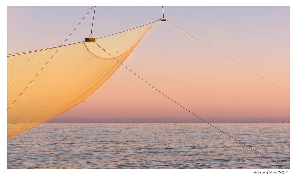 I delicati colori di questa alba o tramonto sono molto belli e ben si abbinano al particolare giallo della rete illuminata lateralmente dalla delicata luce solare.