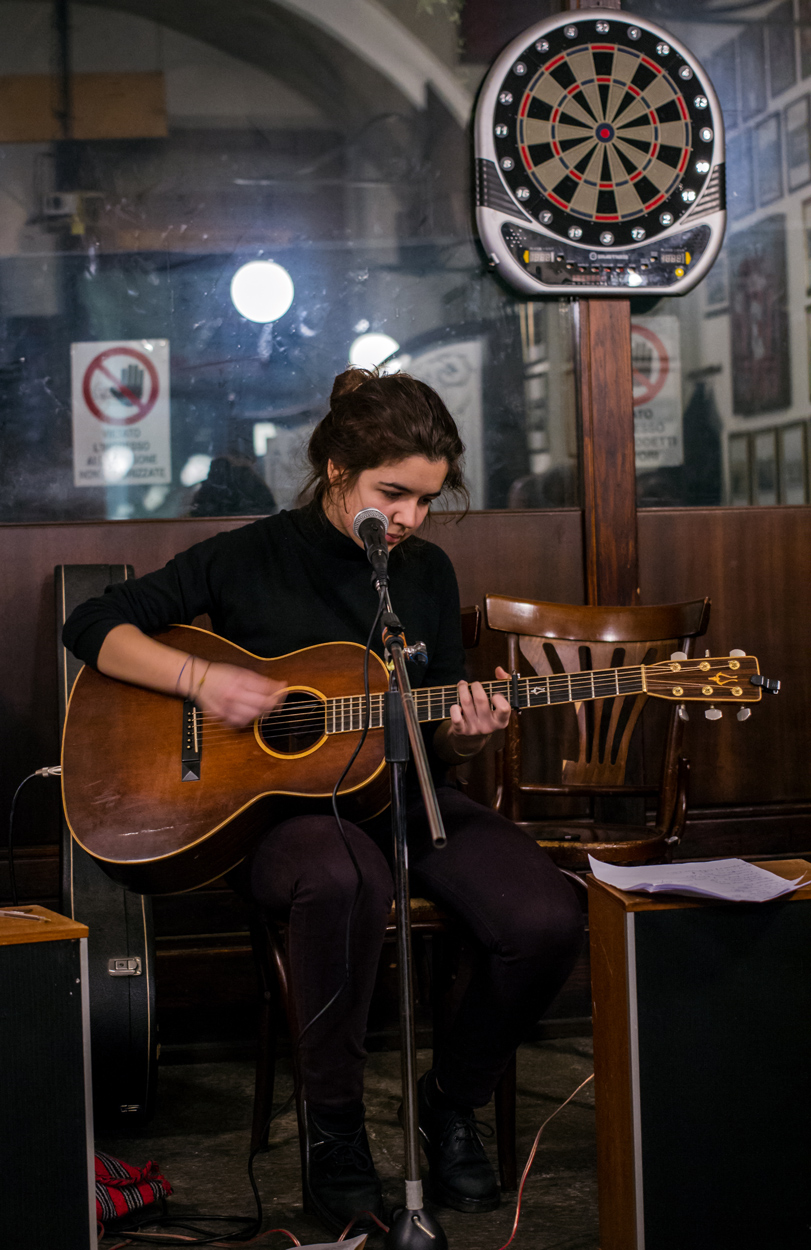 Il problema principale (oltre ai tanti "ingombri" davanti e dietro al soggetto, che pure possono contribuire a fare ambiente) è nel mal bilanciato gioco di luminosità, dato che la giovane chitarrista è eccessivamente oscurata ed il resto, lo sfondo in particolare, eccessivamente illuminato in rapporto al ruolo che ciascuna delle parti ha.