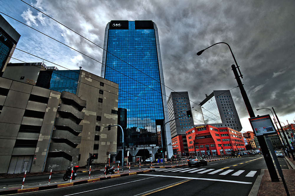 Un soggetto e un'inquadratura decisamente interessanti. Tuttavia credo che la struttura in primo piano penalizzi la godibilità dell'intera scena ricca di colore e riflessi accattivanti. Proporrei un'inquadratura più stretta limitata agli edifici moderni.