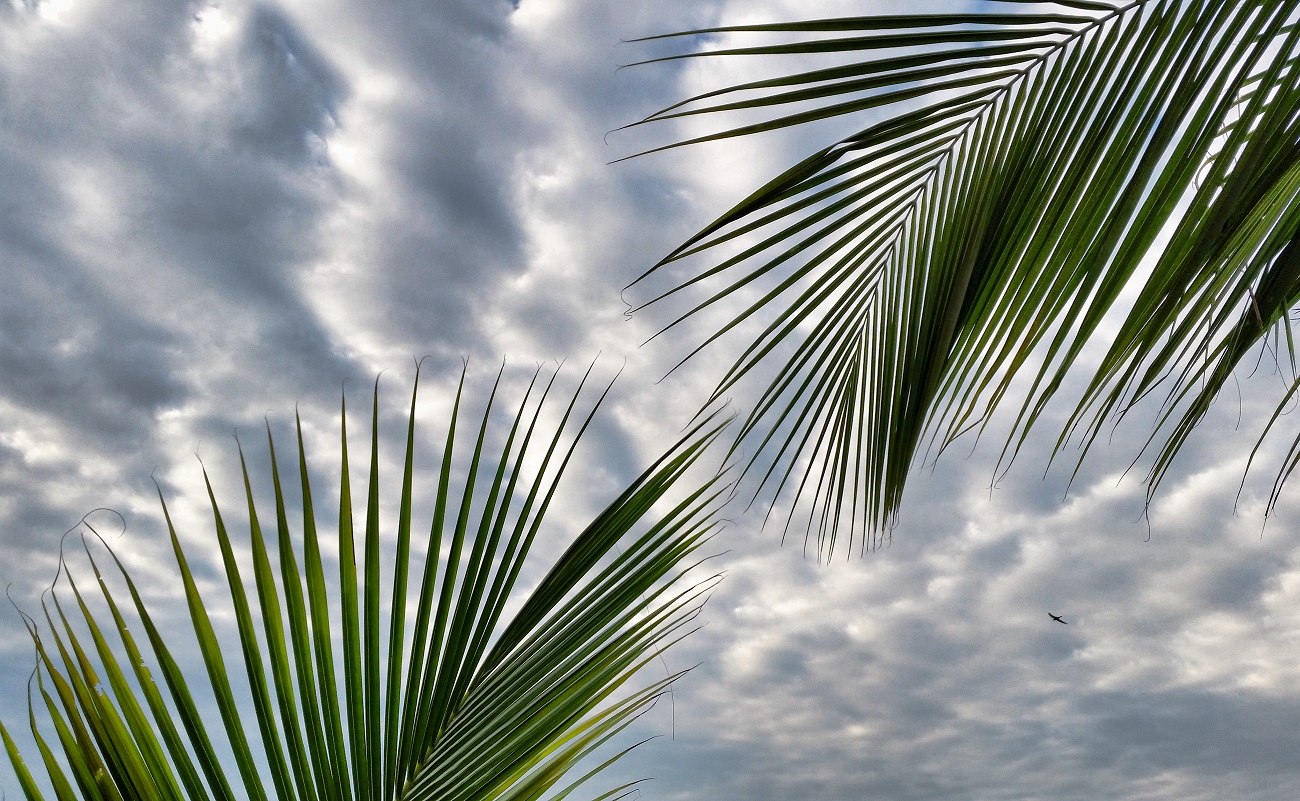 mi piace l'interazione palmiziale, delicata e a lettura bifronte ( 1-elegante dolce:2- affilata tagliente) quindi sbanalizzante; intrigante sinergia estetica fra foglie e cielo; l'uccello è piccolo, eppure così ben delineato svolge bene il suo romantico volo..