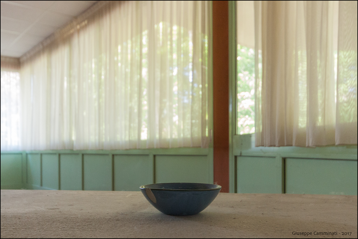 Per me si percepisce la solitudine e il silenzio di questo interno. Eppure il risultato complessivo é comunque di eleganza , anche se in ... stand-by... diciamo così! Un piccolo passetto a destra e forse non avresti fatto coincidere il bordo ciotola con la retta verticale scura in sfondo. Ma allora il brillio chiaro di destra della curvatura della ceramica di sarebbe notato meno?