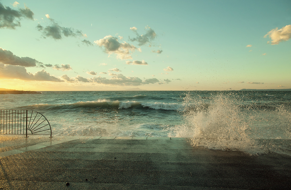 Un cross processing dorato che accoglie in brillantezza la polverizzata invasione di campo. Una delle tue ottime visioni marine, dalla rilassante atmosfera, ma sempre con una nota speciale , come questo attimo dinamico ,fermato nel tempo. Molto bello anche il soggetto al lato sinistro: la curva della l cancellata di protezione, che allunga nel controluce le sue ombre grafiche sul cemento bagnato.