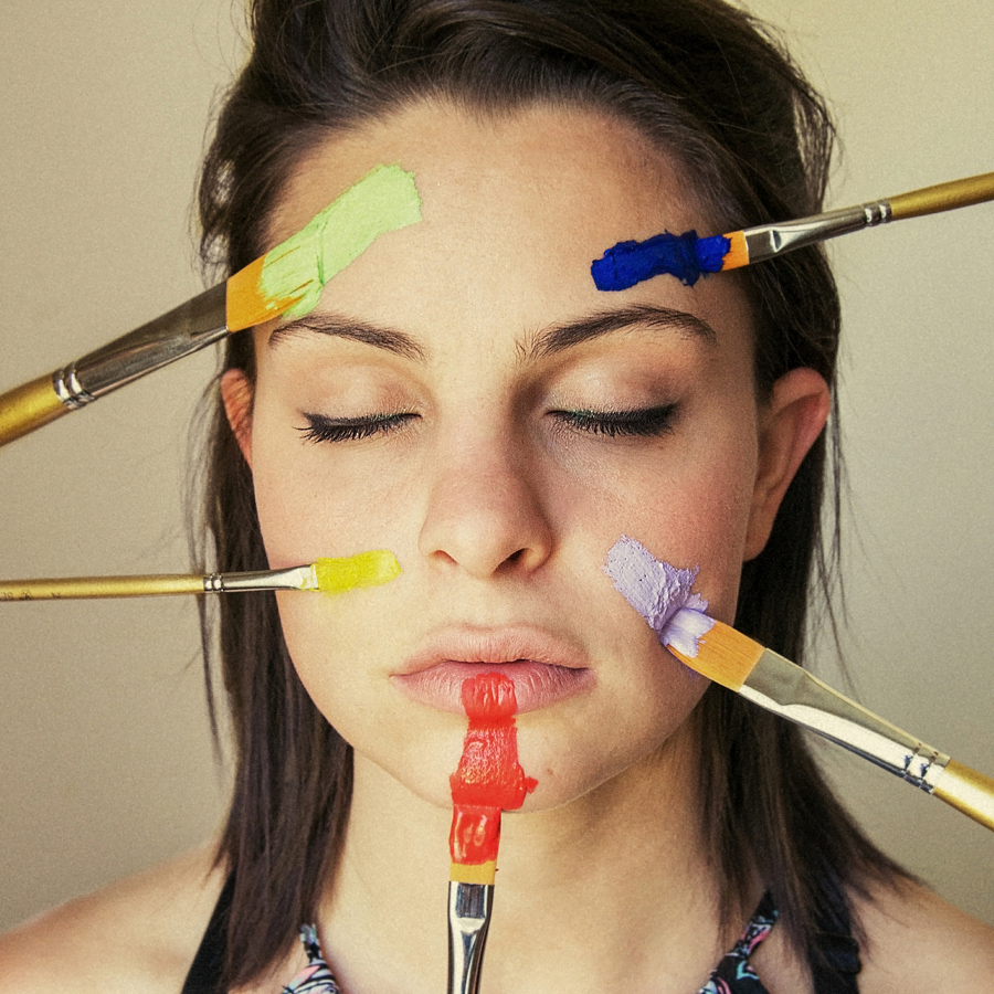 Gli occhi chiusi sono una scelta azzeccatissima, perché fanno immaginare le sensazioni della modella mentre sentiva i pennelli a contatto con la pelle.