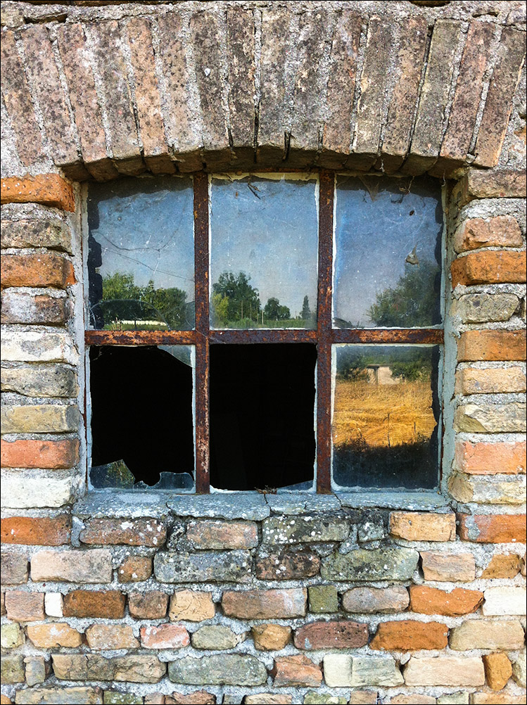 il muro incornicia la finestra, la trattiene a se ma il riflesso sui vetri rimasti ci mostra un bel paesaggio con verdi brillanti e coltivazioni dai toni dorati e questo ci fa spaziare liberandoci da qualsiasi costrizione