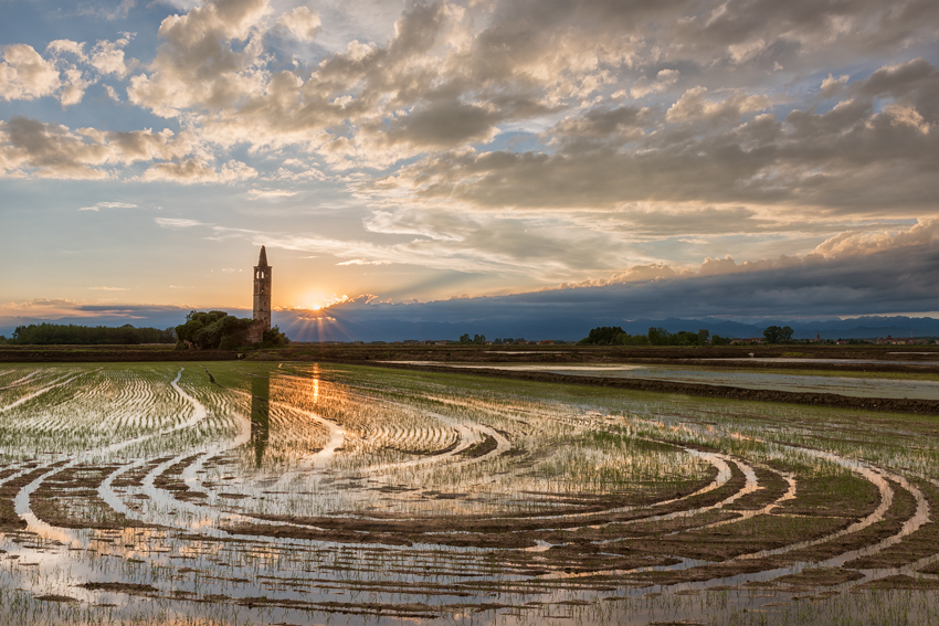 Ritroviamo.questo meraviglioso paesaggio campestre, questa volta in un tramonto dai toni dorati. Bellissima la composizione che sfrutta le sinuose linee tracciate nella risaia. Molto bello il verde dei germogli che crea un trama sfumata sul sottile velo d'acqua