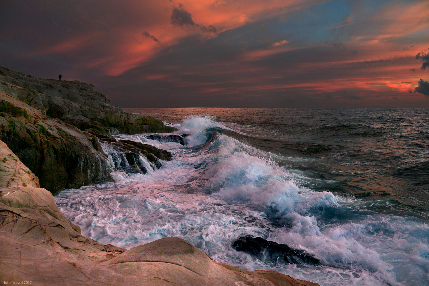Onda spumosa e scogliera percorrono diagonalmente il frame. La luce della sera riscaldata da un'infuocato tramonto che riflette le sue rosse cromie sulla superfice bianca e vaporosa dell'ondata che si infrange sugli scogli.