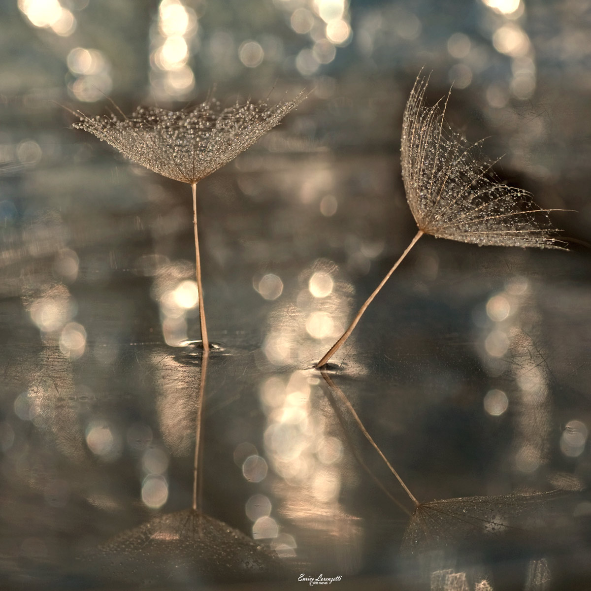 Si è quasi in soggezione a commentare una foto come questa. Un metallo prezioso in forma liquida sembra avvolgere, con sfumature sia d'oro che d'argento, la leggerezza imperlata dei due fiocchi.
