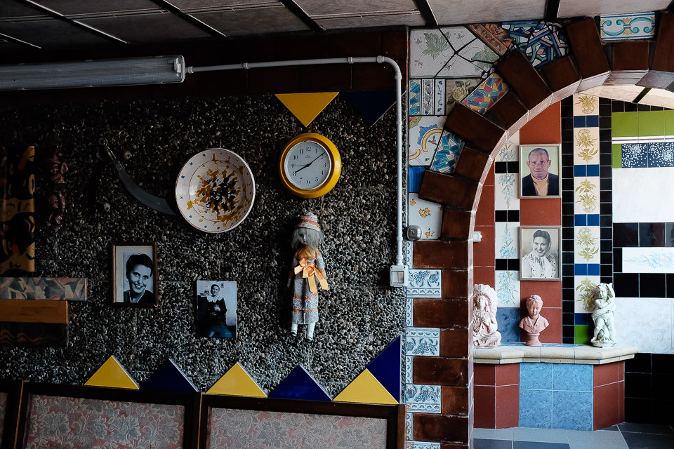 In questa foto c'e' una persona ma non fisica. Un ritratto senza il soggetto principale. Vediamo i suoi ricordi, la foto dei suoi cari, la sua bambola. L'ambiente descrive l'arte di arrangiarsi, lo si nota dal collage di piastrelle che coprono e decorano le pareti. Sono decorazioni e piccole pezzature di ceramica immagino regalate o acquistate per poche lire (andiamo indietro nel tempo) e sono posate in modo estremamente creativo utilizzando tutti i formati in modo sia funzionale sia di composizione. Il tocco di classe seppur in linea con la modestia economica del tutto e' dato dalle 3 statue che riproducono un putto, il busto di un ragazzo/a ed un'indiano. Figure estremamente diverse sia per luogo che per tempo che denotano un gusto artistico/culturale che spazia a 360 gradi.