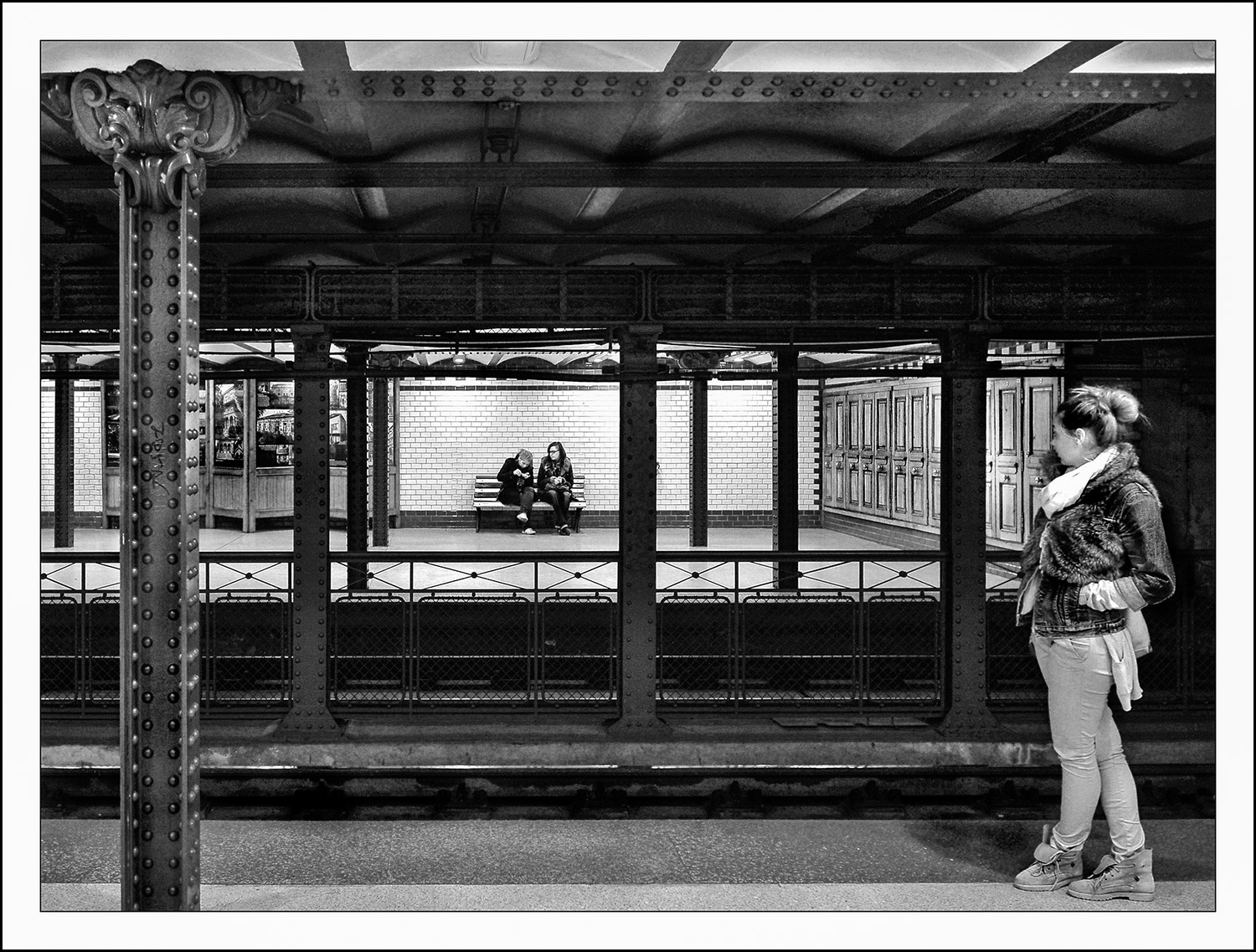 si siedono o restano in piedi, qualcuno può nervosamente attendere andando avanti ed indietro; qui vediamo una ragazza ferma davanti al binario con lo sguardo dall'espressione incuriosita che è attratto e rivolto verso il fondo dove due donne sono sedute a guardare qualcosa.