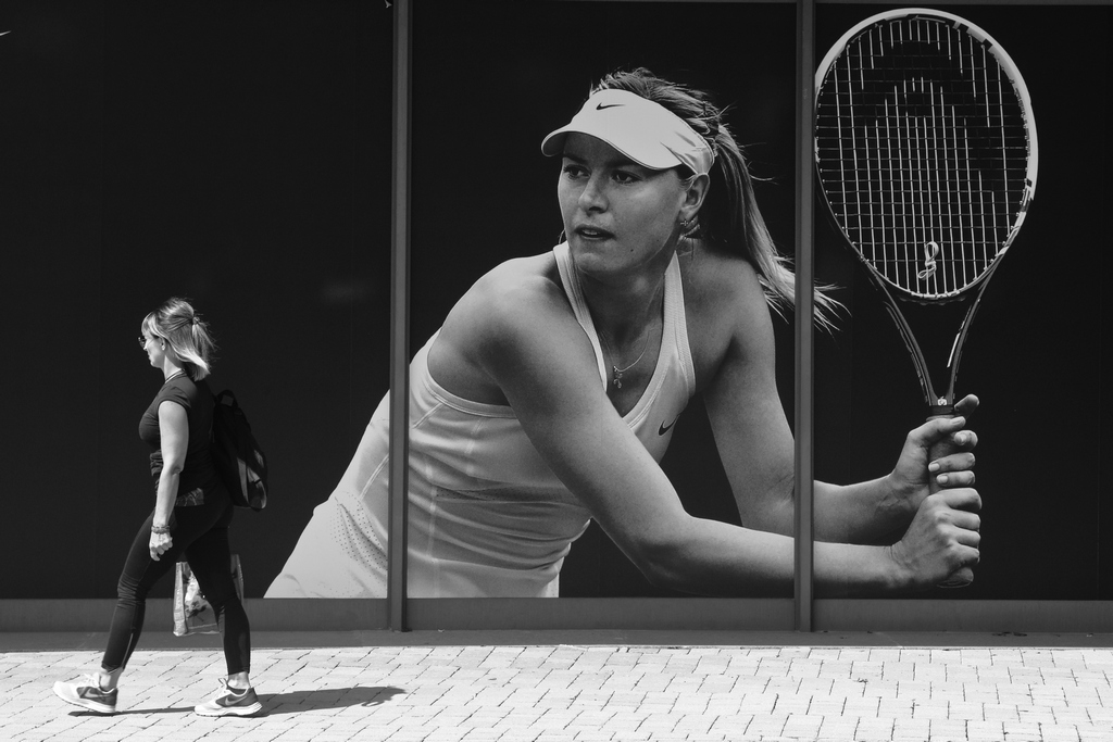 Un nanosecondo e la Sharapova castigherà con un rovescio ( dopato?... eheh) la povera signora. Il tutto in bianco della tennista, e il tutto in nero della passante ,contribuiscono alla armonia della scena.