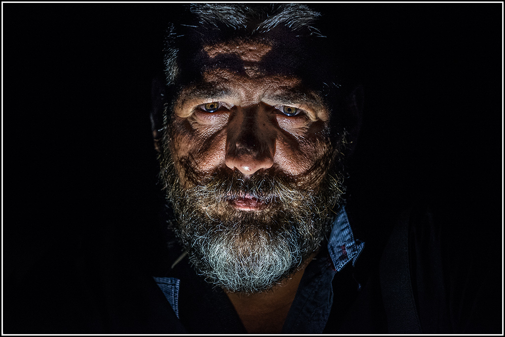 Al primo impatto arriva la nota austera, il chiaroscuro quasi caravaggesco, la forza dei contrasti. Poi si fanno strada note luminose, schegge brillanti di azzurro, l'argento della barba folta e il ceruleo trasparente elle iridi. Quando la forza è gentile, si immagina un volto come questo.
