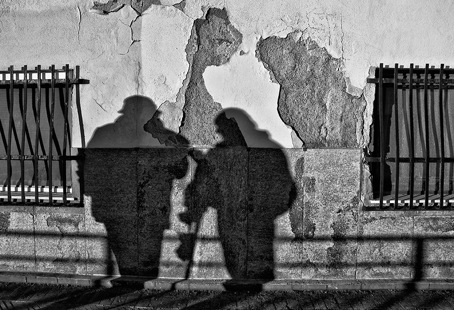 Il muro decisamente scavato dall'assenza del rivestimento dell'intonaco esterno sembrano i fumetti del dialogo delle due ombre.
