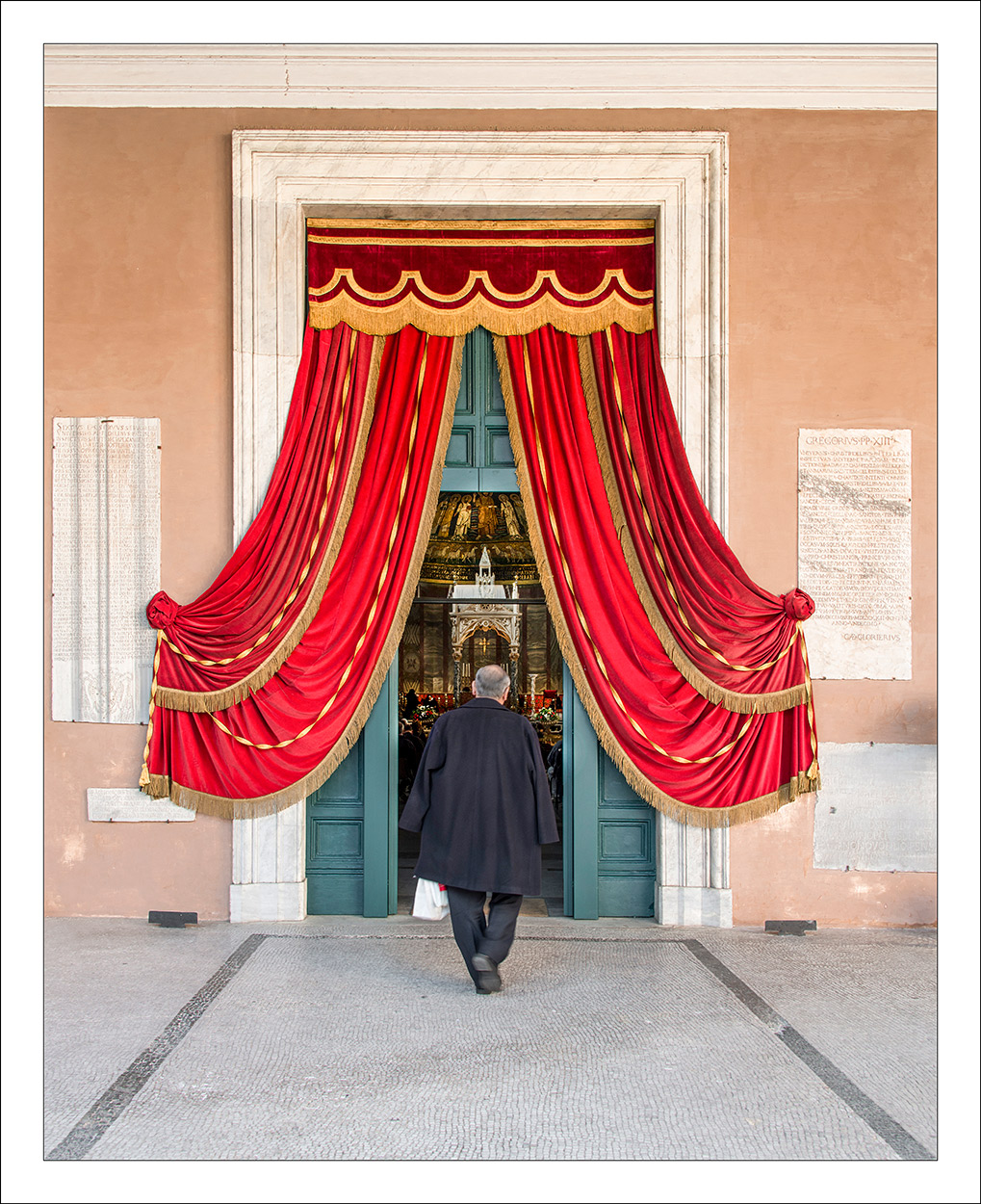 Precisione compositiva e tinte che ben si abbinano, ma, sopratutto, un senso di regalità, come di reverenza, ad insaputa , e qui sta il bello, del semplice protagonista in ingresso, un fedele come tanti, da parte dell rosso cardinalizio dei drappi: tendaggi che sembrano aprirsi per lui, rendendo rispettoso omaggio al suo passare.