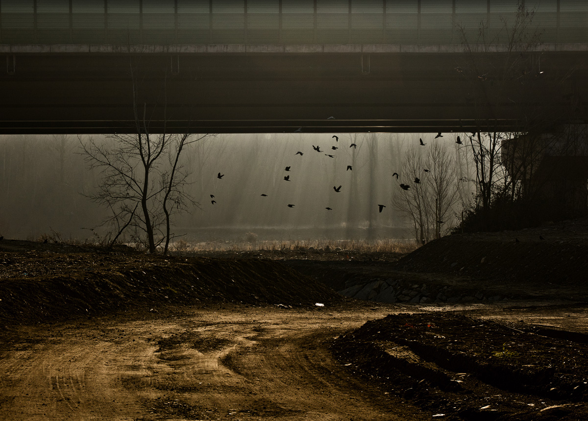 Luce che filtra dietro un cavalcavia ed un volo di uccelli in controluce. Lo spoglio alberello e la terra bruna completano questo ottimo scatto.