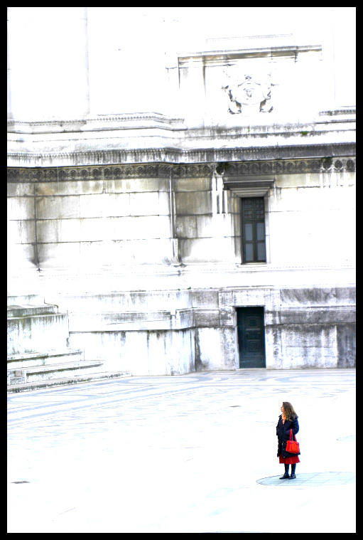 Non so chi ti ha suggerito il titolo, ma mi pare particolarmente azzeccato, con questa minuscola donna frastornata che guarda questa costruzione tanto grande.