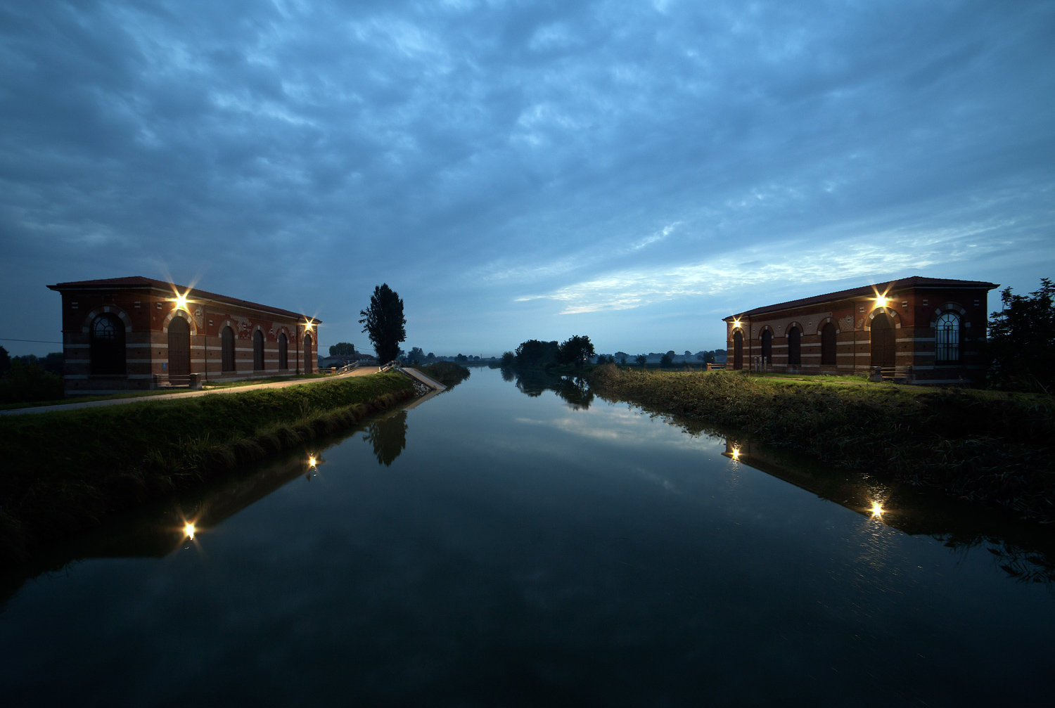 Ottimo l'impianto compositivo e tanta tana suggestione per questa notte i arrivo, ricca di simmetricità brillante di poche luci a stella, che si riverberano nell'acqua del canale.E la lieve trasparenza azzurra che si lascia ammirare attraverso al trema luminosa di un cancello nella costruzione.... è speciale.