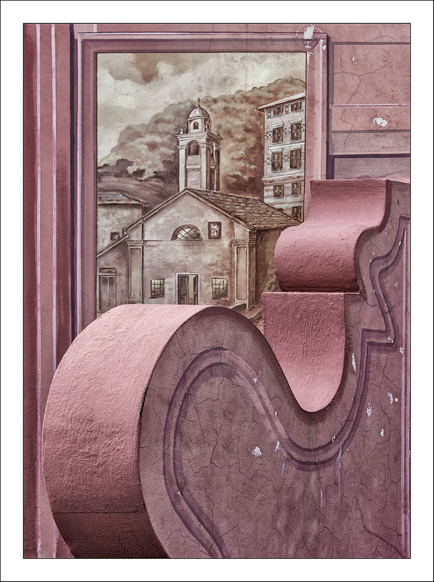 Prospettiva e colore. i due elementi di questa immagine. Fotografare i muri liguri equivale a tuffarsi nel colore,patrimonio di Liguria, e qui la cosa che mi colpisce è il monocromatico, quel viola/rosa così caratteristico, Mi piace che abbia voluto mostrare anche un'altra abilità dei Mastri liguri che è l'affresco, e non poteva mancare l'onda ,così materica e che bene hai fatto a lasciare con le sue vissute screpolature. Tu cammini per il borgo e vedi colore e non è da tutti saperlo rendere.