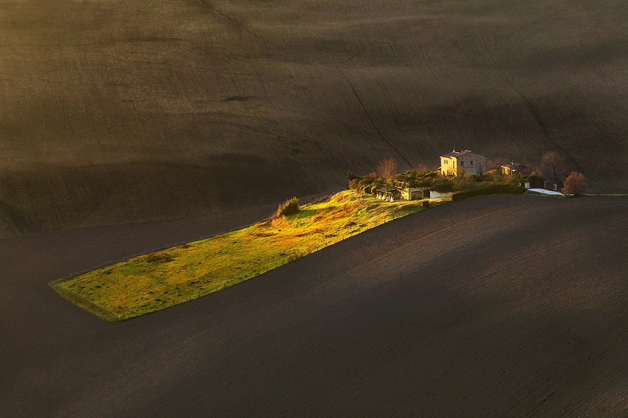 Perdonami Luca ma sommessamente voglio andare un pò controcorrente rispetto al sentimento comune emerso in questo post. E lo faccio nella convinzione che la pluralità di idee sia un valore aggiunto in qualsiasi ambito se condotta con garbo. Taglio, location e soggetto formidabili, ma trovo la PP esageratamente innaturale. Lo stacco fra le due tipologie di terreno, pur se oggettivamente esistente, è, a mio giudizio, eccessivo e risulta troppo 'finto'. Il colore scelto per la proprietà incastonata nella campagna toscana (presumo) fa pensare ad una strisciata con l'evidenziatore e questo per me la rende un tantino kitsch. Più equilibrata la tua foto precedente che potrebbe essere anche origine di questa in virtù di un crop. Simile impronta anche in "___!__----___" dove però si potrebbe pensare ad una lama di luce esasperata da un'azzeccata esposizione poi coerentemente trattata. Difficile ormai in fotografia determinare il confine fra le varie categorie da una parte e l'Artwork dall'altra, ma questo scatto lo collocherei indubbiamente in quest'ultima. Nuova, emergente, divertente, dalle enormi potenzialità ma che troppo spesso si allontana dalla fotografia e troppo spesso strizza l'occhiolino alla facile lettura.