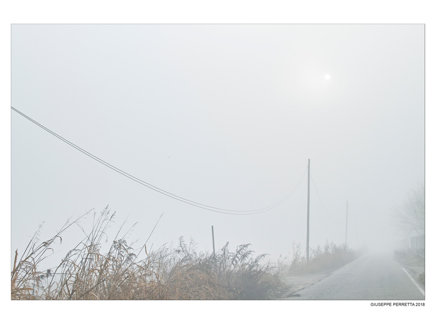 Il sole si arrende al soffice manto omogeneo di una nebbia assoluta, che lascia spazio solo ad un vago cerchio di chiarore luminoso, pallido e senza potere, mentre le sole molli curve dei cavi hanno il lasiapassare per nideizza e presenza nella tua scena. Perfettaemnte composta con la via retta e decentrata a condurre silenziosamente lo sguardo an perdersi in avantiavanti, mentre il regno nebbioso occupa ogni altro spazio . Mi piace molto e metto una preferenza a questa scena.