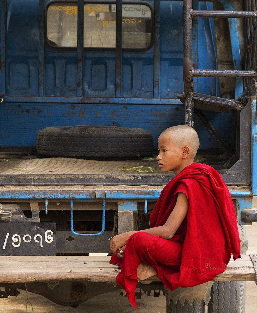 Anna parla di ritratto ambientato ed è vero, potrebbe essere considerato tale. Ma con onestà devo dire che, una volta tanto, non avevo pensato ad un ritratto mentre scattavo ma piuttosto a una piccola scena ambientata, con questo giovane monaco che si godeva un momento di riposo seduto su uno scalcinato camion. E stato seduto per pochissimo (come tutti i ragazzini del mondo) e quindi, non volendo nemmeno che si accorgesse di me che stavo scattando, non ho potuto scegliere la posizione migliore. Pertanto concordo che la scaletta (se non ricordo male era infatti una scaletta che permetteva di salire sul tettuccio) possa dare fastidio e riconosco che la proposta di Cristian sia ottimale, ma io solitamente non intervengo mai a modificare scatti di viaggio (se non tagliando marginalmente se la scena lo permette). Inoltre ho mantenuto la parte superiore per una mia fisima, ma mi piaceva il rimando della scritta in caratteri birmani con quelli che poi si vedono in basso.