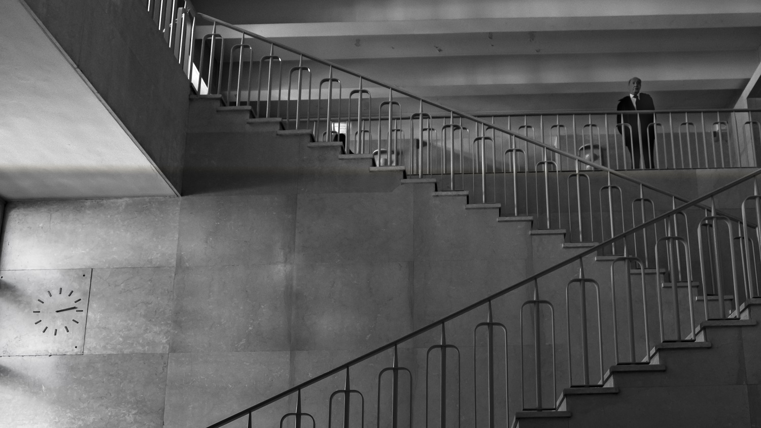 Scherzi a parte io non credo, come già detto, che senza titolo e soprattutto la tua spiegazione sarebbe stata immediata la comprensione, pensaci un attimo. Si vede un uomo dall'aria severa ma uno potrebbe pensare di tutto, che sia così di natura, che abbia litigato con la moglie ecc. Oppure che sia incacchiato col fotografo visto che lo osserva ma non necessariamente per questioni orarie. Dal punto di vista della visione a prescindere da significati trovo più essenziale la mia proposta che crea oltretutto un bel gioco di uscite se ci fai caso, e poi una sorta di X rovesciata che a me piace molto. La stessa figura umana si posiziona meglio nel contesto e si disperde meno perchè orologio a parte la parte sx tagliata serve a poco.  |