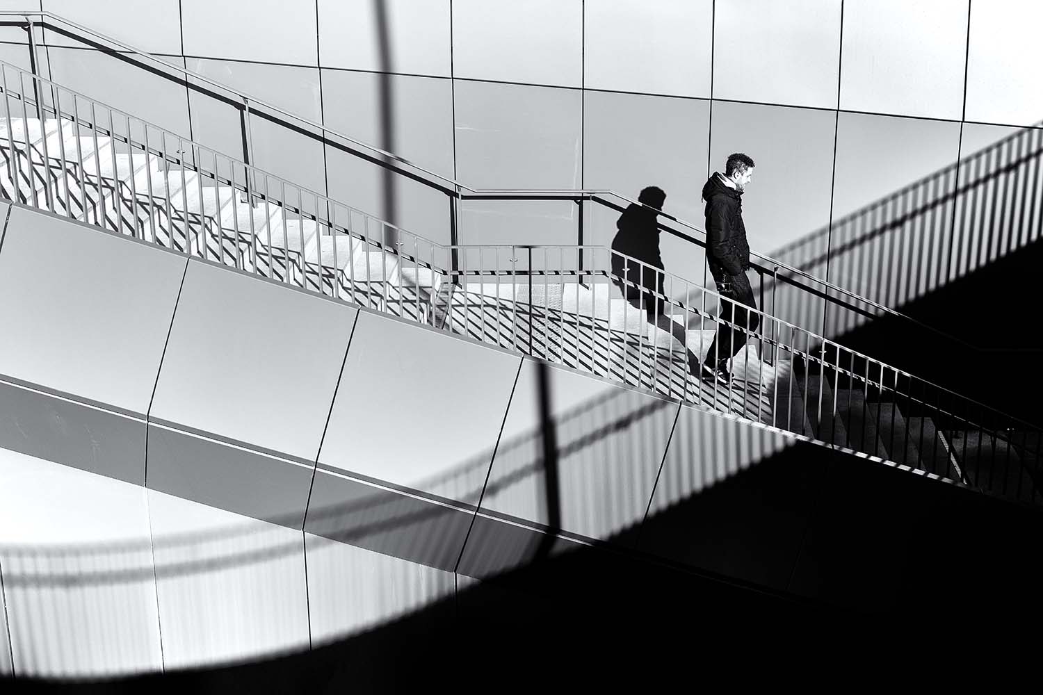 Linee rette e curve, ombre nette e sfumate. E la presenza umana.