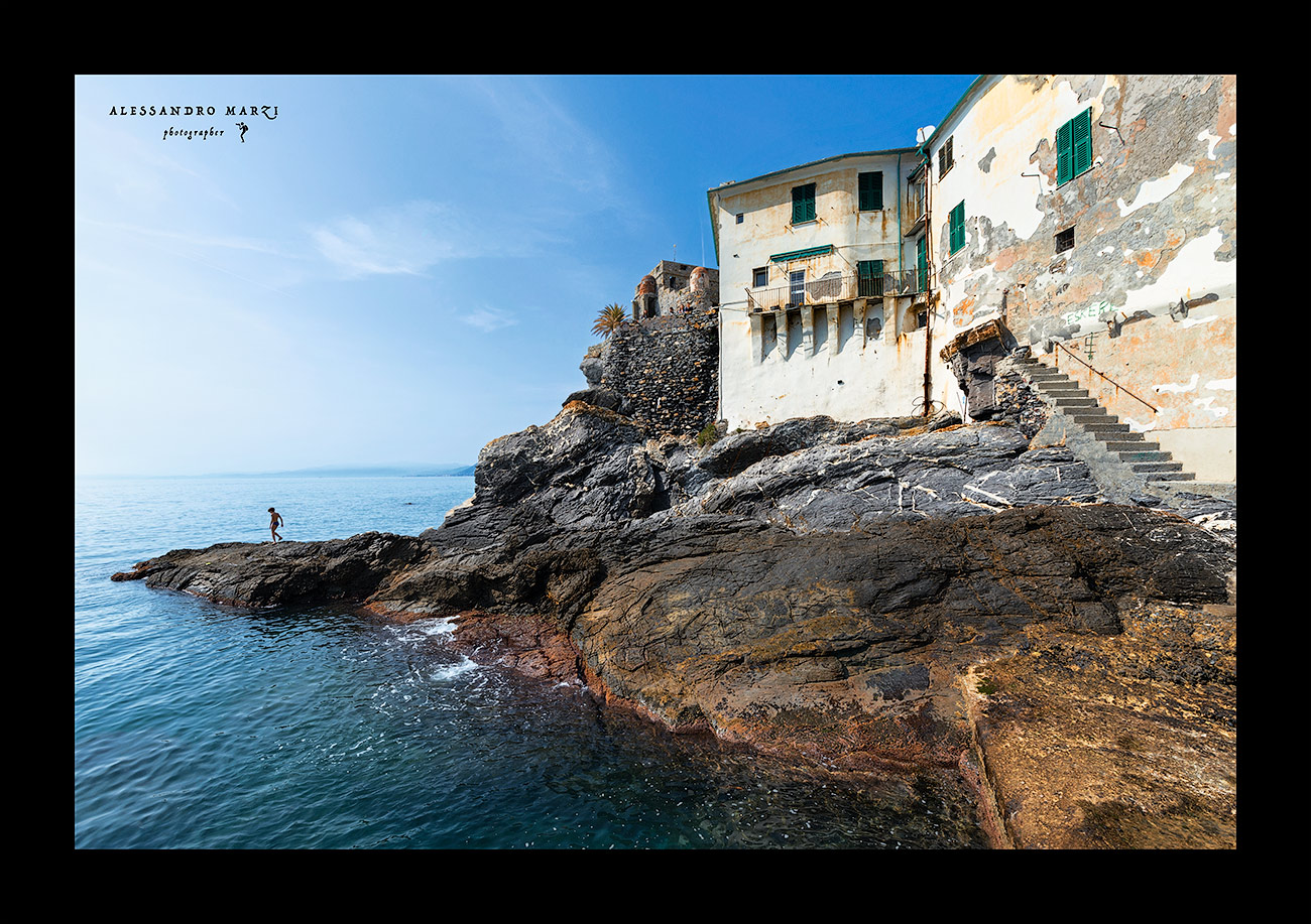 Qui osi fotografare,, e proporre paesaggisticamente, in un orario non prettamente canonico, e con una luce letteralmente da saper domare. Ma lo fai senza complessi e soprautto qui non punti tutti sulla mera carta descrittiva. Compo classica , per assecondare scogli ed abitato, eppure, con una nota speciale , ecco la presenza umana, là dove lo scoglio termina nel mare. Piccolo ma fondamentale per trasformare la scena in racconto.