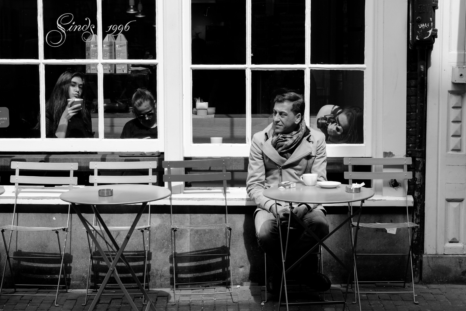 Mi incuriosisce la fotografa dentro che riprende la tipa imbronciata...il tutto coperto dal personaggio in relax (mobile caffè tabacco).
