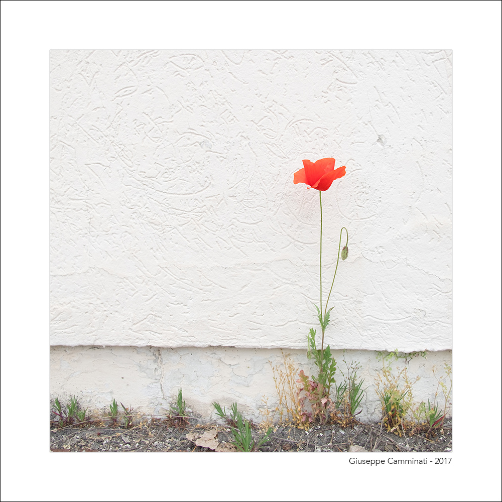 Lo sfondo del muro chiaro, nei due terzi superiori, con le sue volute di segni incisi, è quesi un omaggio alle bellezza del papavero, un sostegno sinergico al suo innalzarsi longilineo e colorato contro il bianco.