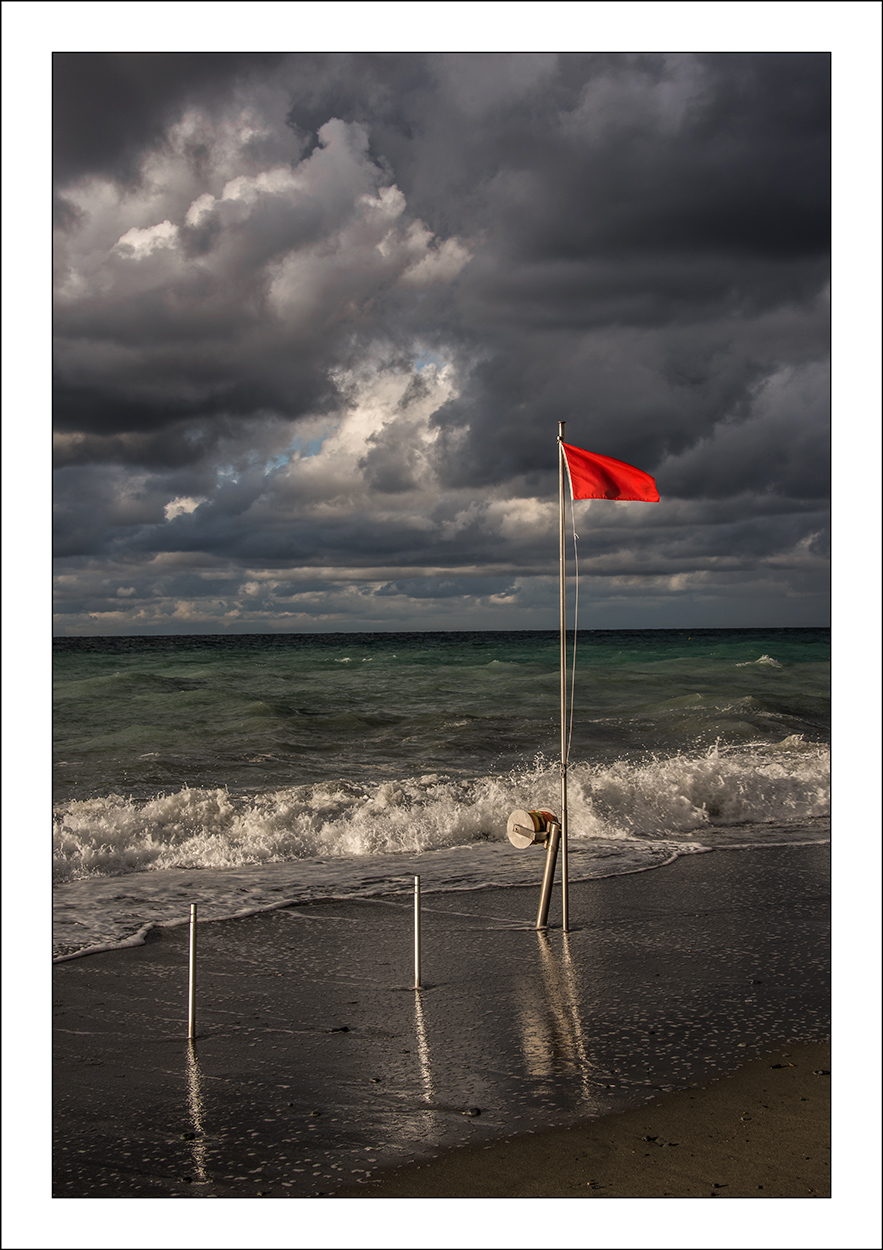 A volte capita a tutti di non notare le cose basilari come il mare in salita, ma la foto e' davvero bella. La potenza degli elementi e' ben resa e quella bandierina rossa svolazzante cattura .