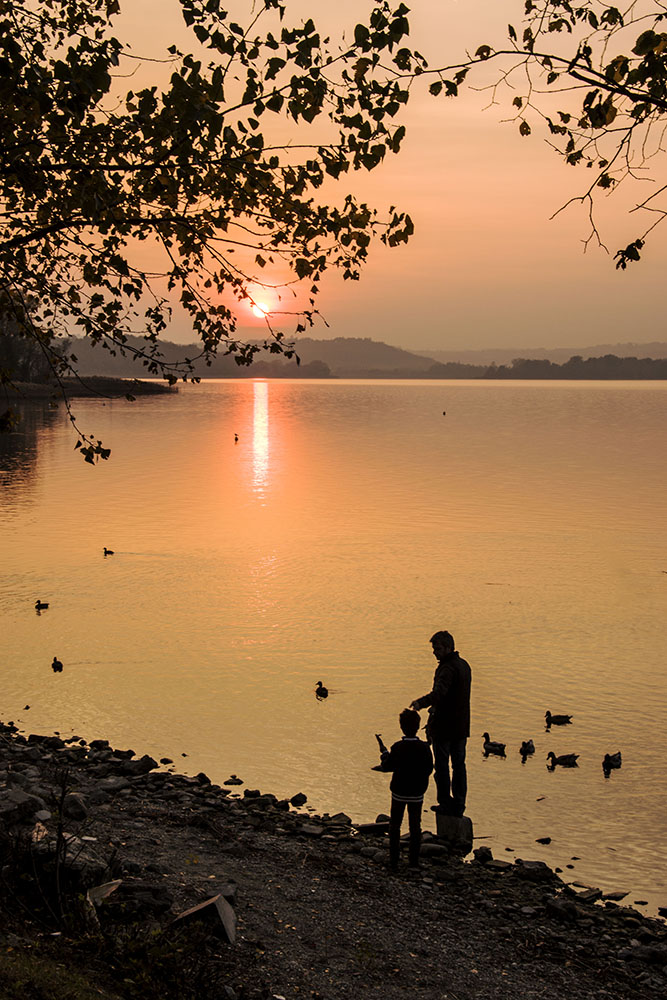 Che meraviglia. La trama di un film in un fotogramma. Un momento padre figlio sulla riva di un lago fiammeggiante. Uno scrigno di ricordi che si stanno tessendo in questo momento e che saranno recuperati in avvenire, magari a distanza di anni. Tinte poetiche e silhouette a disegnare i tratti salienti di un tramonto incantevole. L'evanescenza di quei clivi all'orizzonte. Stellina _________________ - Fotografo della domenica |