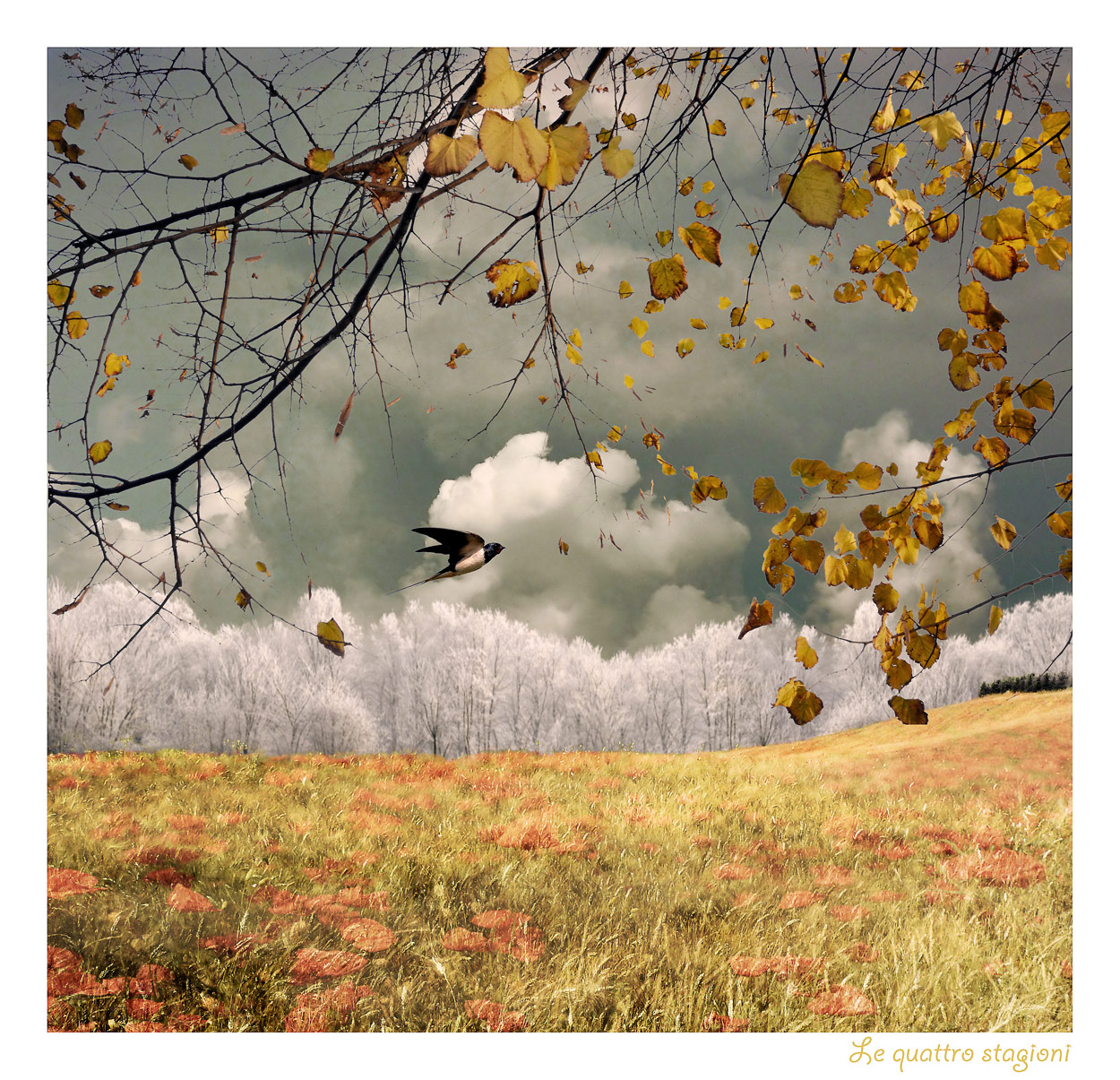 Che bella. Ci sono tutte le stagioni ,in questo pari lato, sotto la regia di un singolo volo. Le tonalità del bruno fanno da collante visivo ad ogni elemento. E un passaggio di rondine lega le chiome bianche e le foglie cadute, il cielo gonfio di neve e l'annuncio di una primavera ancora invisibile. Preferite.