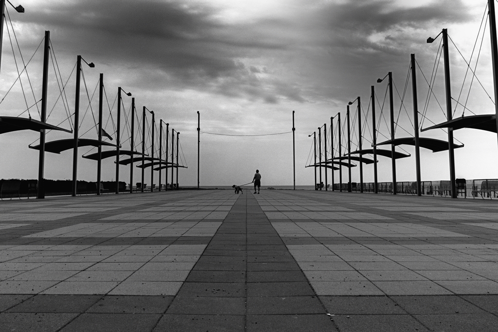 mi piace questa prospettiva che conduce lo sguardo alla persona che con il suo cane sembra tagliare il traguardo. Ottimo b/n