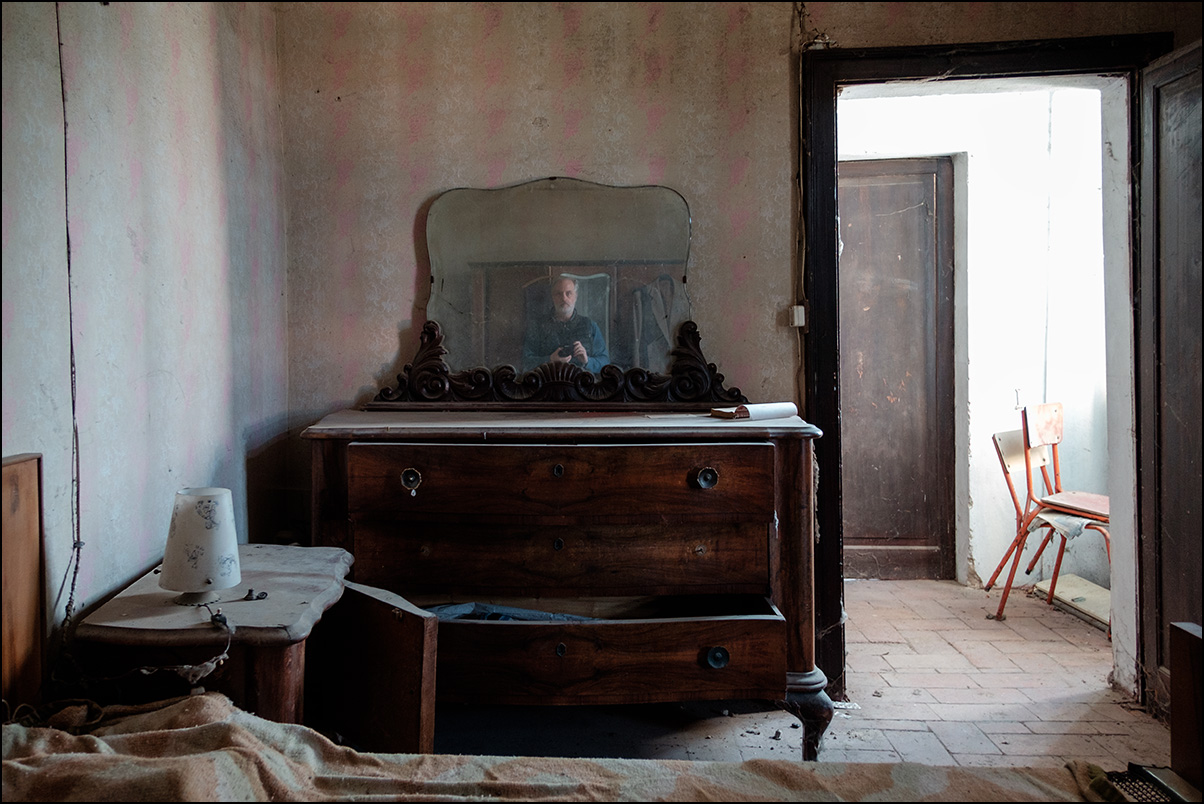 Immagine splendida che veicola un messaggio molto triste. Il tuo riflesso evanescente nello specchio da quel tocco di spettrale, inquietante a questa composizione che odora di antico, di abbandono. Ma un'anima ancora si aggira ...
