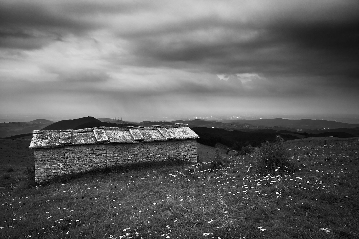 Un bel BN di carattere, bellissimi i fiori bianchi che si stagliano dal prato. Rifilerei solo un po' di cielo ad ottenere un formato panoramico