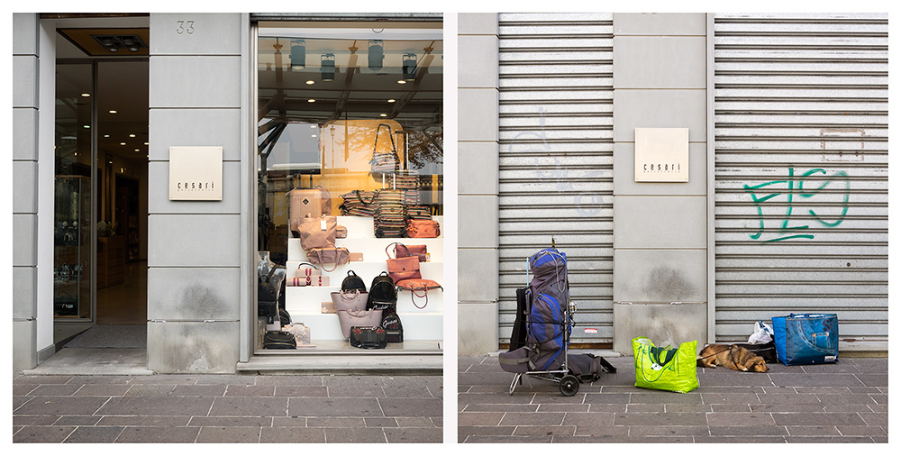 Scatti che fanno riflettere e che quindi sviluppano appieno la potenzialità della fotografia. Ti suggerirei di limare il muro a sin. della serranda nel secondo scatto in modo da renderlo uguale per larghezza a quello del primo scatto. Una sciocchezza naturalmente, giusto per rendere il dittico ultraperfetto